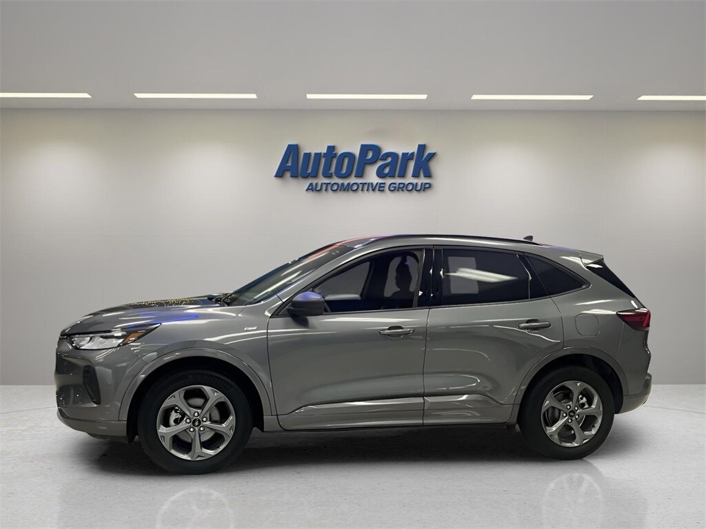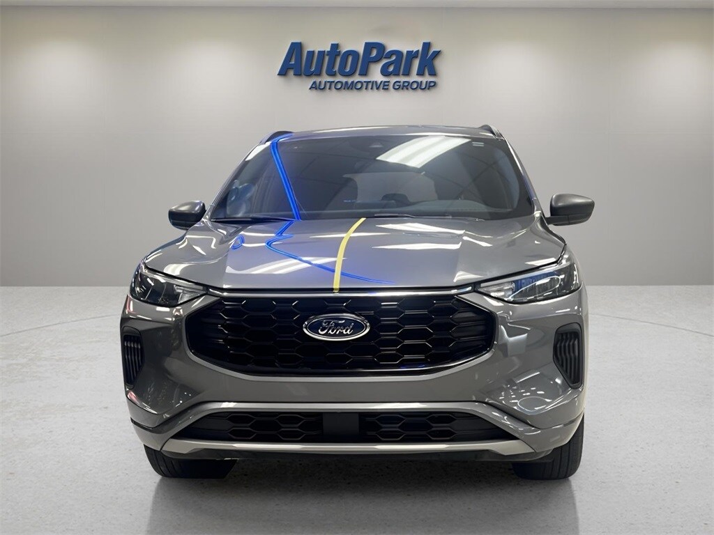 Vehicle Is Equipped With Cold Weather Package (Heated Front Row Seats, Heated Sideview Mirrors, Heated Steering Wheel, and Remote Starter System), Equipment Group 300A, Escape ST-Line, 4D Sport Utility, 1.5L EcoBoost, 8-Speed Automatic, AWD, Carbonized Gray Metallic, Ebony w/Vinyl/Cloth Front Sport Contour Bucket Seats, 3.81 Axle Ratio, 4-Wheel Disc Brakes, 6 Speakers, ABS brakes, Air Conditioning, Alloy wheels, AM/FM radio: SiriusXM, AM/FM Stereo, Auto High-beam Headlights, Automatic temperature control, Brake assist, Bumpers: body-color, Compass, Delay-off headlights, Driver door bin, Driver vanity mirror, Dual front impact airbags, Dual front side impact airbags, Electronic Stability Control, Emergency communication system: SYNC 4 911 Assist, Exterior Parking Camera Rear, FordPass Connect, Four wheel independent suspension, Front anti-roll bar, Front Bucket Seats, Front Center Armrest, Front dual zone A/C, Front reading lights, Fully automatic headlights, Illuminated entry, Knee airbag, Low tire pressure warning, Occupant sensing airbag, Outside temperature display, Overhead airbag, Overhead console, Panic alarm, Passenger door bin, Passenger vanity mirror, Power door mirrors, Power driver seat, Power Liftgate, Power steering, Power windows, Radio data system, Rear anti-roll bar, Rear reading lights, Rear seat center armrest, Rear window defroster, Rear window wiper, Remote keyless entry, Roof rack: rails only, Speed control, Speed-sensing steering, Speed-Sensitive Wipers, Split folding rear seat, Spoiler, Sport steering wheel, Steering wheel mounted audio controls, SYNC 4, Tachometer, Telescoping steering wheel, Tilt steering wheel, Traction control, Trip computer, Variably intermittent wipers, Vinyl/Cloth Front Sport Contour Bucket Seats, and Wheels: 18" Rock Metallic Painted Aluminum.