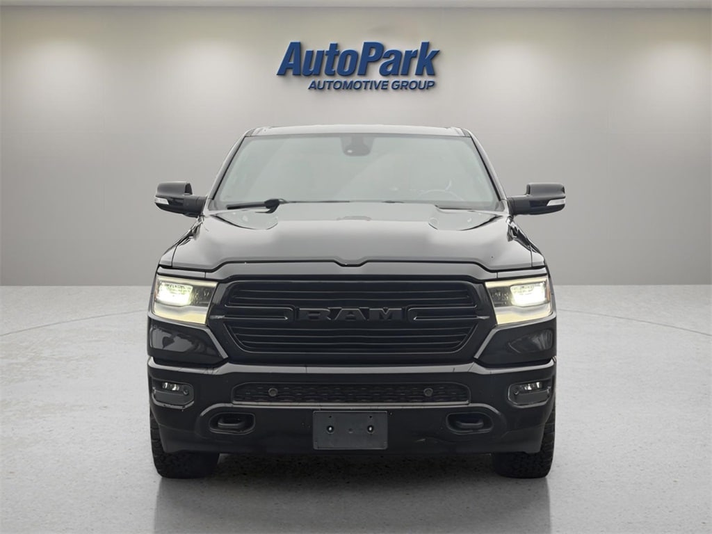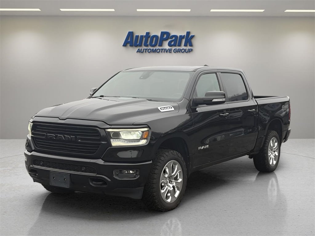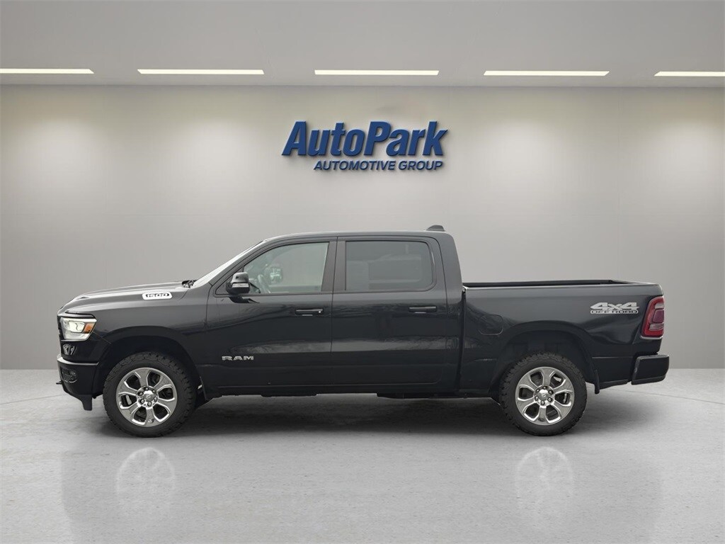 Vehicle Is Equipped With Big Horn Level 2 Equipment Group (115V Auxiliary Power Outlet, 115V Auxiliary Rear Power Outlet, 2 USB Full Function/Charge Only Media Hub, 2nd Row In Floor Storage Bins, 400W Inverter, Air Conditioning ATC w/Dual Zone Control, Auto-Dimming Rear-View Mirror, Big Horn IP Badge, Black Premium Power Mirrors, Class IV Receiver Hitch, Dampened Tailgate, Foam Bottle Insert (Door Trim Panel), Glove Box Lamp, Heated Front Seats, Heated Steering Wheel, ParkSense Front/Rear Park Assist w/Stop, Power 4-Way Driver Lumbar Adjust, Power 8-Way Driver Seat, Power Adjustable Pedals, Radio: Uconnect 4 w/8.4" Display, Rear Dome w/On/Off Switch Lamp, Rear Power Sliding Window, Rear Window Defroster, Security Alarm, SiriusXM Satellite Radio, Sun Visors w/Illuminated Vanity Mirrors, and Universal Garage Door Opener), Off Road Group (E-Locker Rear Axle, Front Extra HD Shock Absorbers, Hill Descent Control, Off Road Decals, Rear Extra HD Shock Absorbers, and Tow Hooks), Premium Lighting Group (Front LED Fog Lamps, LED Reflector Headlamps, and LED Taillamps), Quick Order Package 23Z Big Horn (Big Horn Badge), Sport Appearance Package (3 Rear Seat Head Restraints, 4 Way Front Headrests, Black Interior Accents, Body Color Door Handles, Body Color Front Bumper, Body Color Premium Power Mirrors, Body Color Rear Bumper w/Step Pads, Bucket Seats, Deluxe Cloth Bucket Seats, Front Seat Back Map Pockets, Full Length Floor Console, Grille Surround 1 Body Color Texture 2 Black, Manual Adjust 4-Way Front Passenger Seat, Rear 60/40 Folding Seat, and Sport Decal), 1500 Big Horn/Lone Star, 4D Crew Cab, 3.6L V6 24V VVT, 8-Speed Automatic, 4WD, Diamond Black Crystal Pearlcoat, Black w/Cloth High-Back Bucket Seats, 4-Wheel Disc Brakes, 48V Belt Starter Generator, 6 Speakers, ABS brakes, Air Conditioning, Alloy wheels, AM/FM radio, Brake assist, Bumpers: chrome, Cloth Bench Seat, Compass, Delay-off headlights, Driver door bin, Dual front impact airbags, Dual front side impact airbags, Electronic Stability Control, Front & Rear Rubber Floor Mats, Front anti-roll bar, Front Center Armrest
